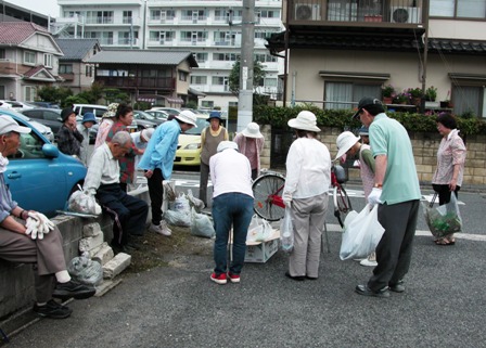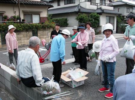 ☆今年度1回目の女性会、グリーンクラブのメンバー中心の町内清掃は、6月15日8:30に植野結納店前に21名が各自ビニール袋、火バサミ、軍手持参で集合しました。川瀬女性会会長の指示により、山崎町内を3方面に別れ、道路の草取り、 ごみ拾いを中心に約1時間実施しました。。 きれいになりました。。