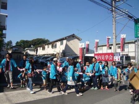 前夜祭の奉納神楽に引き続き翌日の「子どもみこし」にも80名を超える参加者で町内を練り歩き、