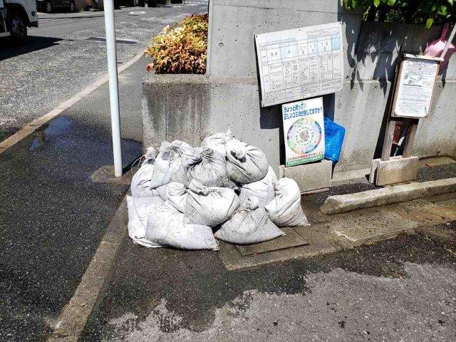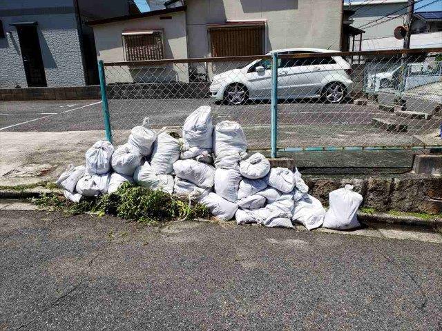 土嚢袋に約50袋の汚泥土砂、草木を取り除きました。雨水の流れが良くなりました。